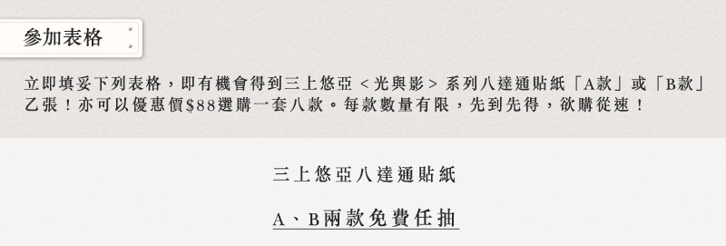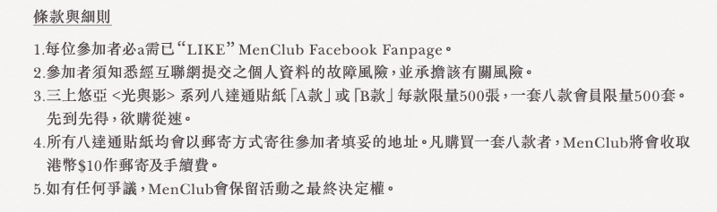 A B 一套八款 Menclub登入名稱: Menclub登入密碼: 參加者英文全名: 身份証號碼頭4位字元(e.g.A123): 日間聯絡電話: 地址1: 地址2: 地址3: 本人已閱讀、清楚了解及同意相關的條款與細則。