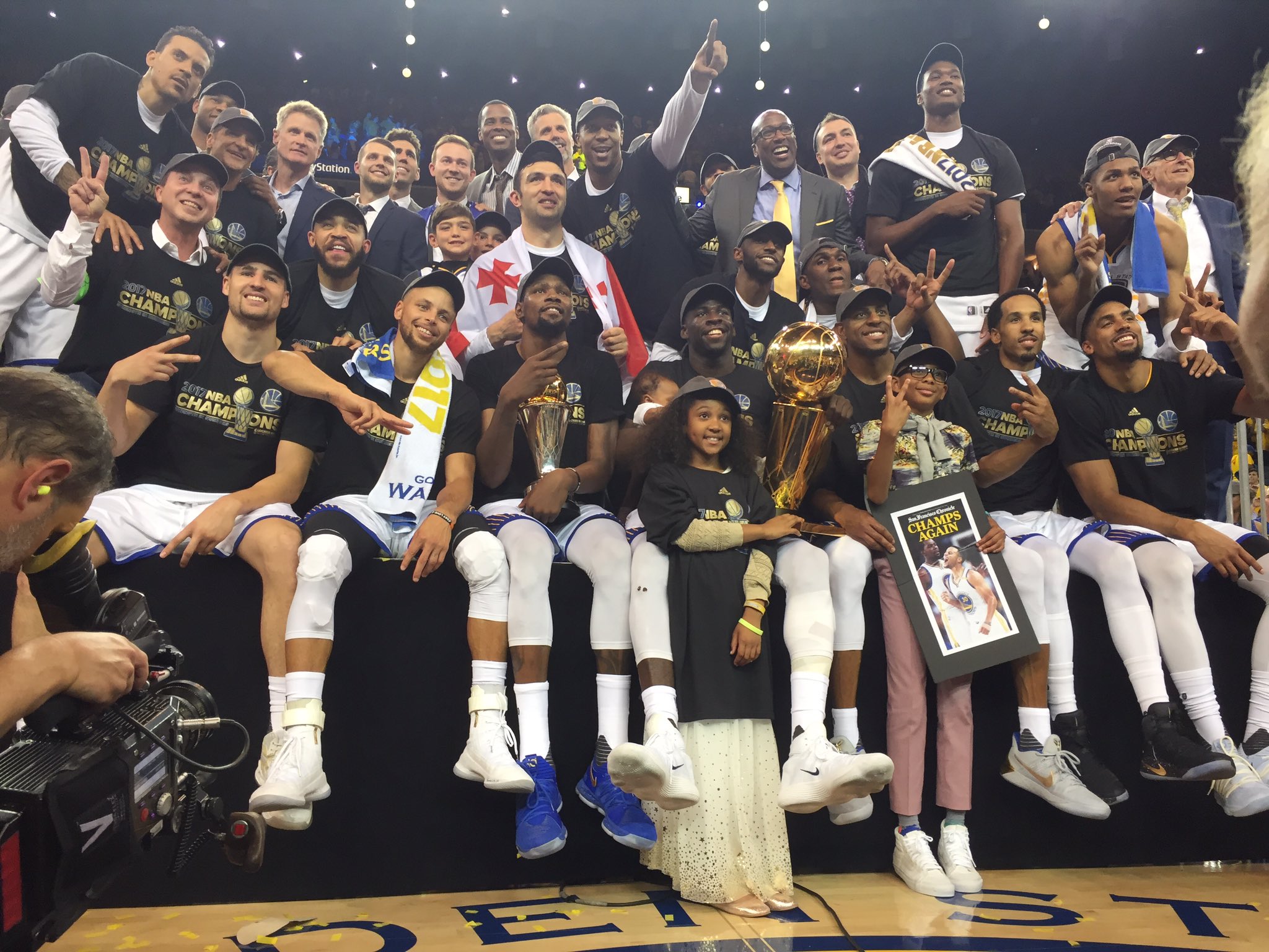 | 賽後,勇士全員及現場所有球迷都大肆慶祝,當球員捧起總冠軍獎盃時全場歡呼聲不斷。今次喺勇士三年內第二次拎到NBA總冠軍,而總決賽MVP(FMVP)就由今年先加盟勇士嘅KD奪得,唔知再一次失去呢個大獎嘅Curry會唔會有啲失望呢? | |